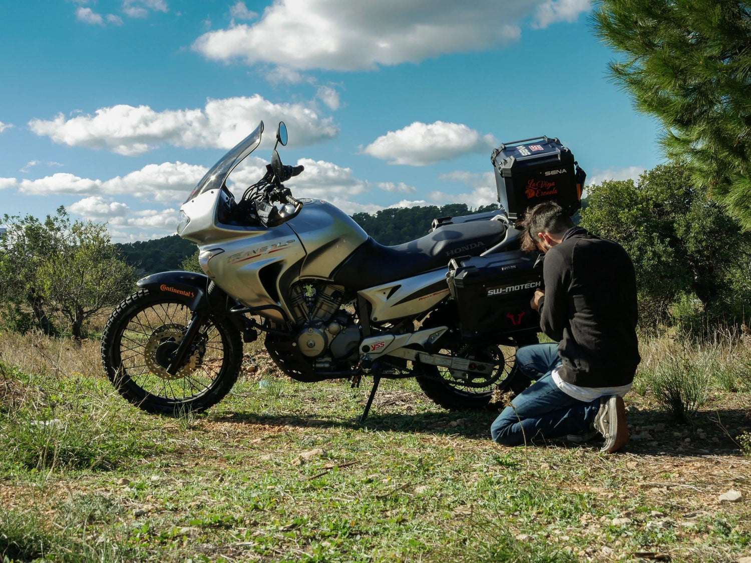- Review : the review and tuning have been carried out by the guys at Moto Center Mallorca , who have been fixing, preparing and customizing motorcycles for more than twenty years. They have that touch of design and craftsmanship that very few preserve. In fact, they are not limited to the basics, but are capable of doing wonders with each motorcycle. They have done an excellent job, adapting the new suspensions and all the accessories that I have decided to put on the Transalp before starting the trip. For me, more than a workshop, it is a dream factory.