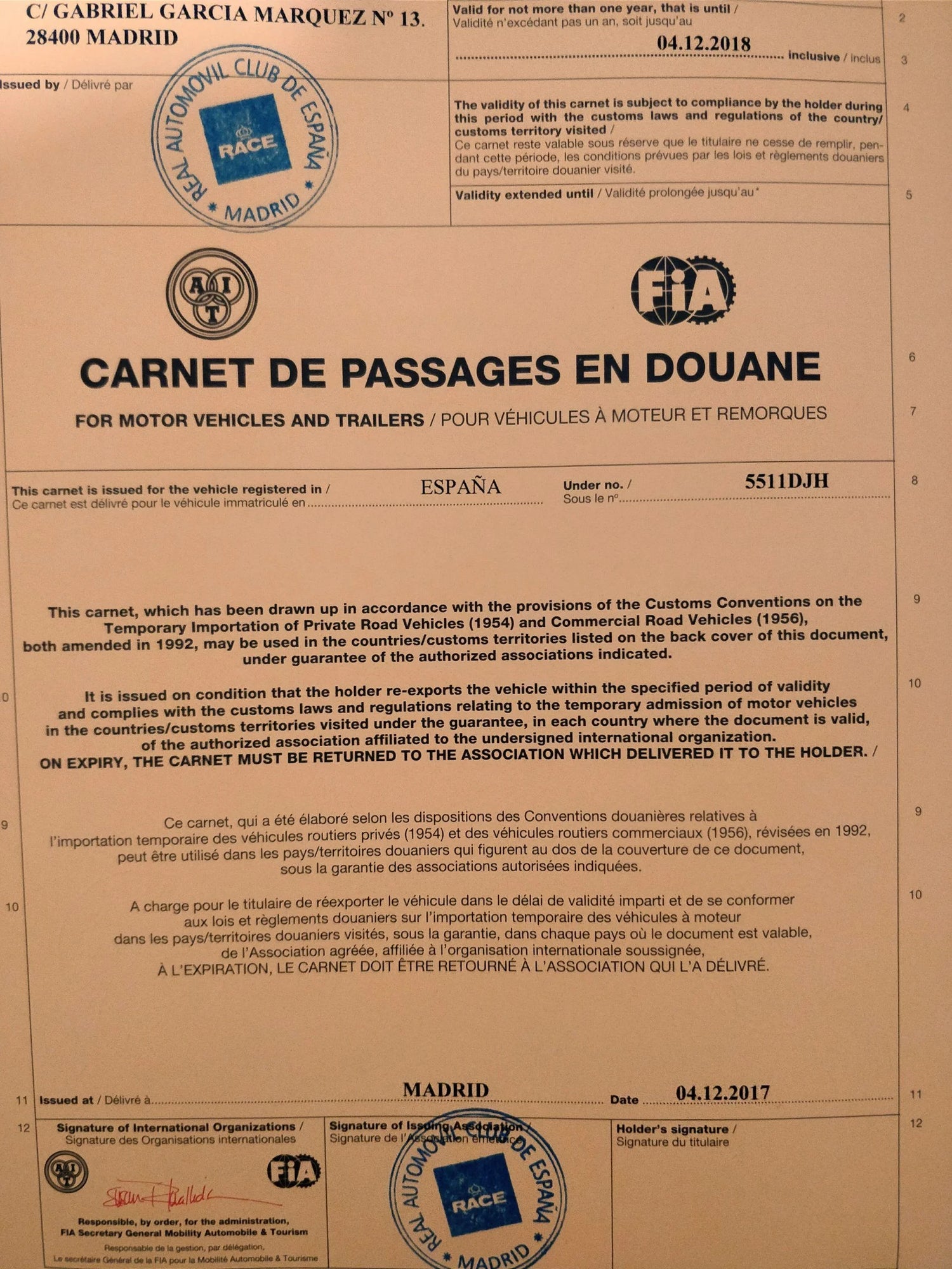 The card is valid for one year, and its cost ranges between €250 and €280 , depending on the number of countries you are going to visit. It has quite a few risks. For example, if you forget, you don't get the exit stamp from a country, your motorcycle is stolen or you have a breakdown and you can't continue, you automatically lose your endorsement. The only organization that manages it in Spain is RACE . I have not found any alternative or a way to avoid having to obtain the license, since on my route there are several countries in which it is "essential" and many others in which it is highly recommended.